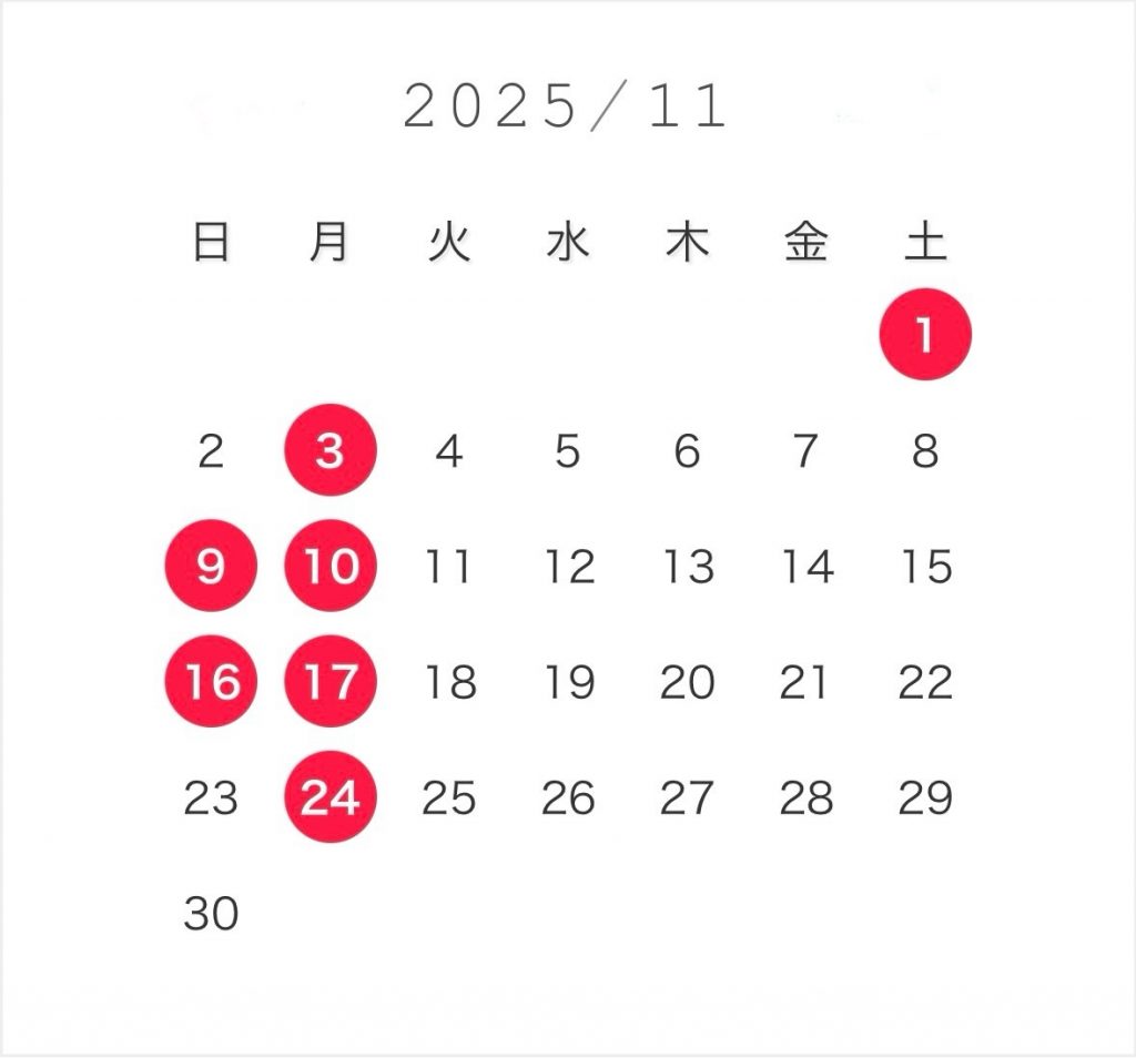 この案内をもって、11月の土日のご予約の受付を開始致します。